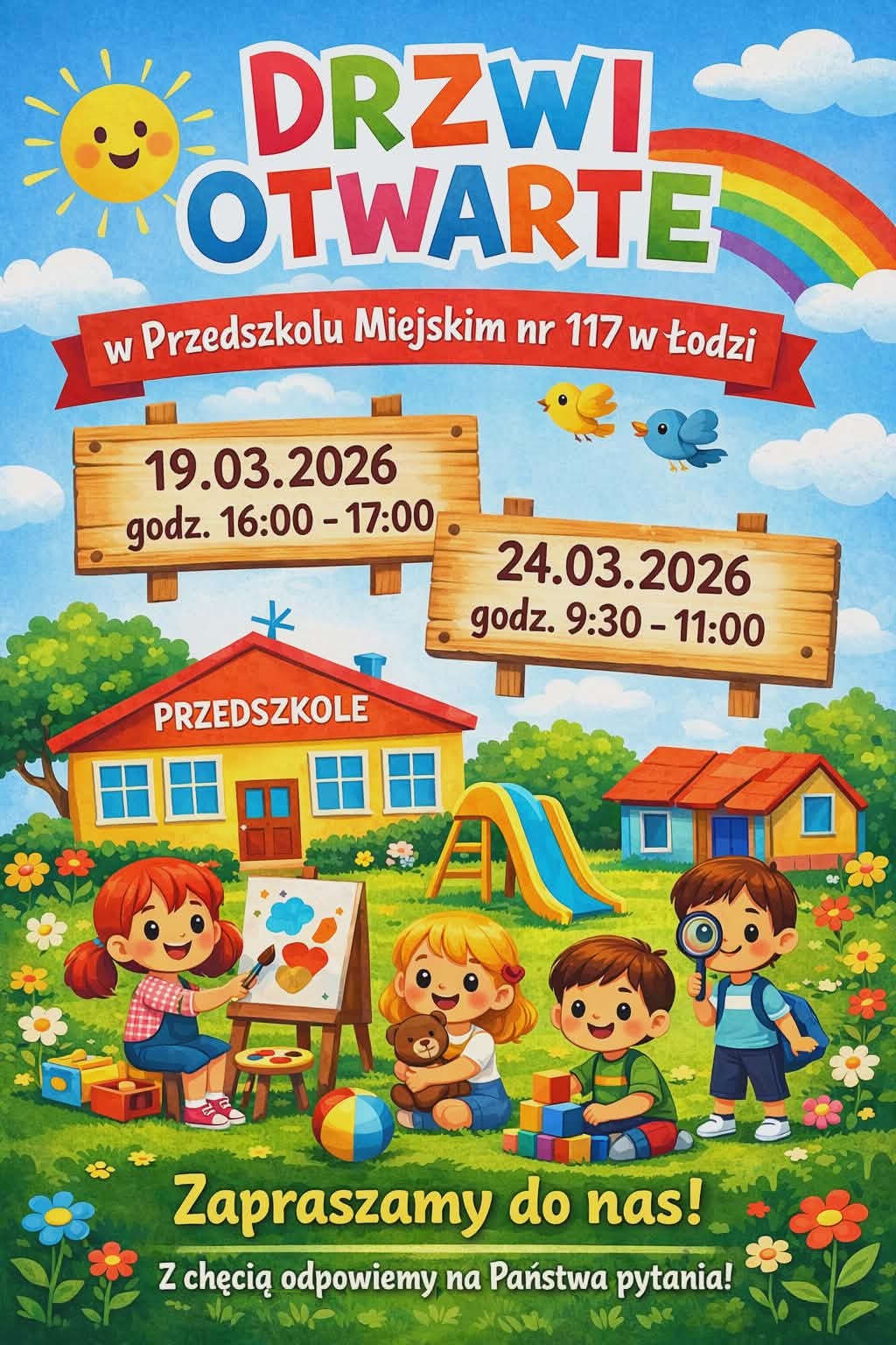 Serdecznie zapraszamy wszystkich chętnych rodziców dzieci mających rozpocząć edukację na "Drzwi otwarte" w naszej placówce, gdzie będziecie mogli Państwo zobaczyć, jak pracujemy, zadać pytania oraz rozgościć się w naszych salach. Termin: 19.03.2026 godzina 16:00 - 17:00 oraz 24.03.2026 godzina 9:30 - 11:00.