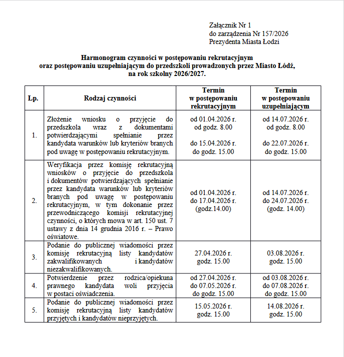 Harmonogram rekrutacji do przedszkola na rok 2026/2027.