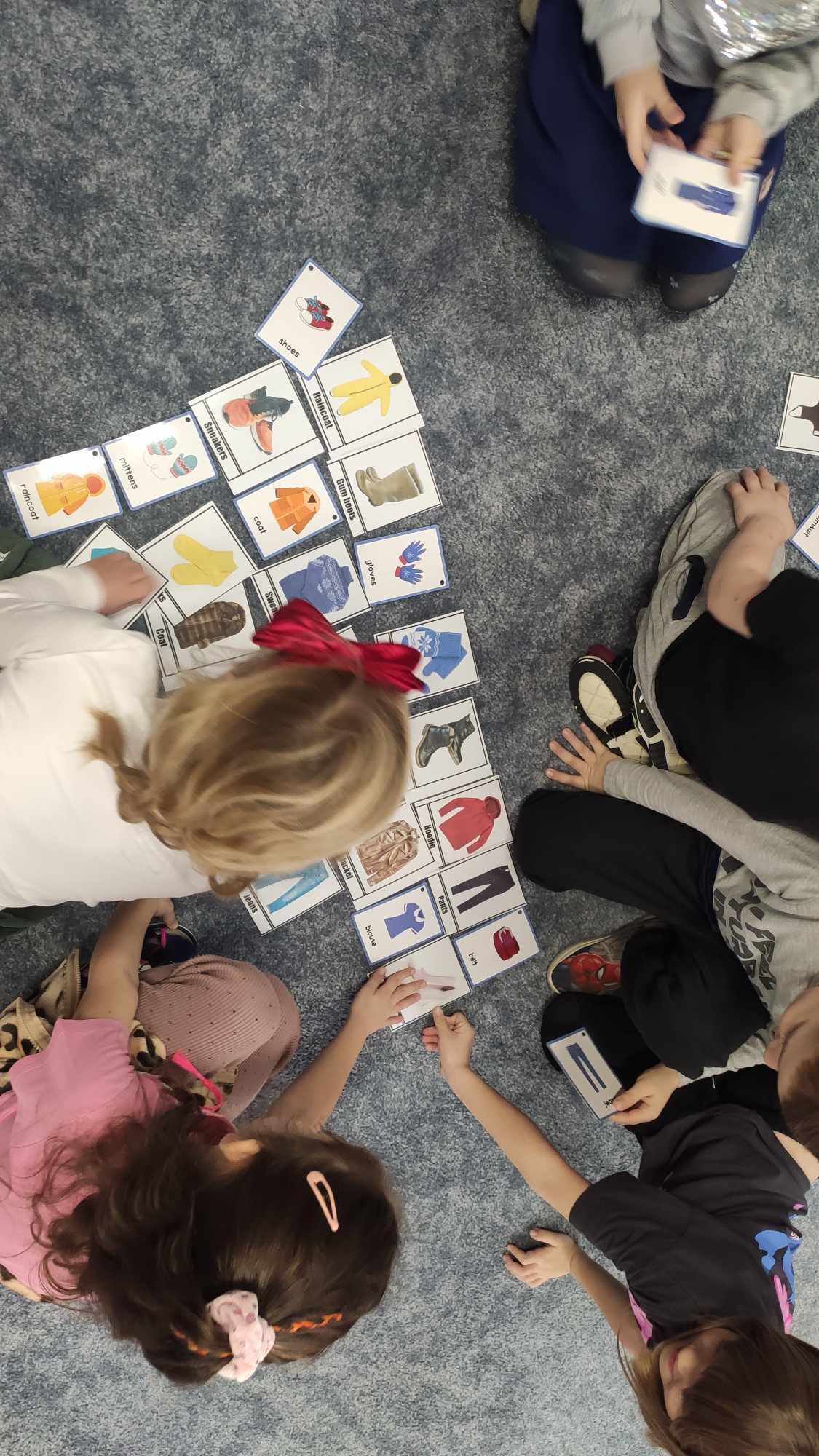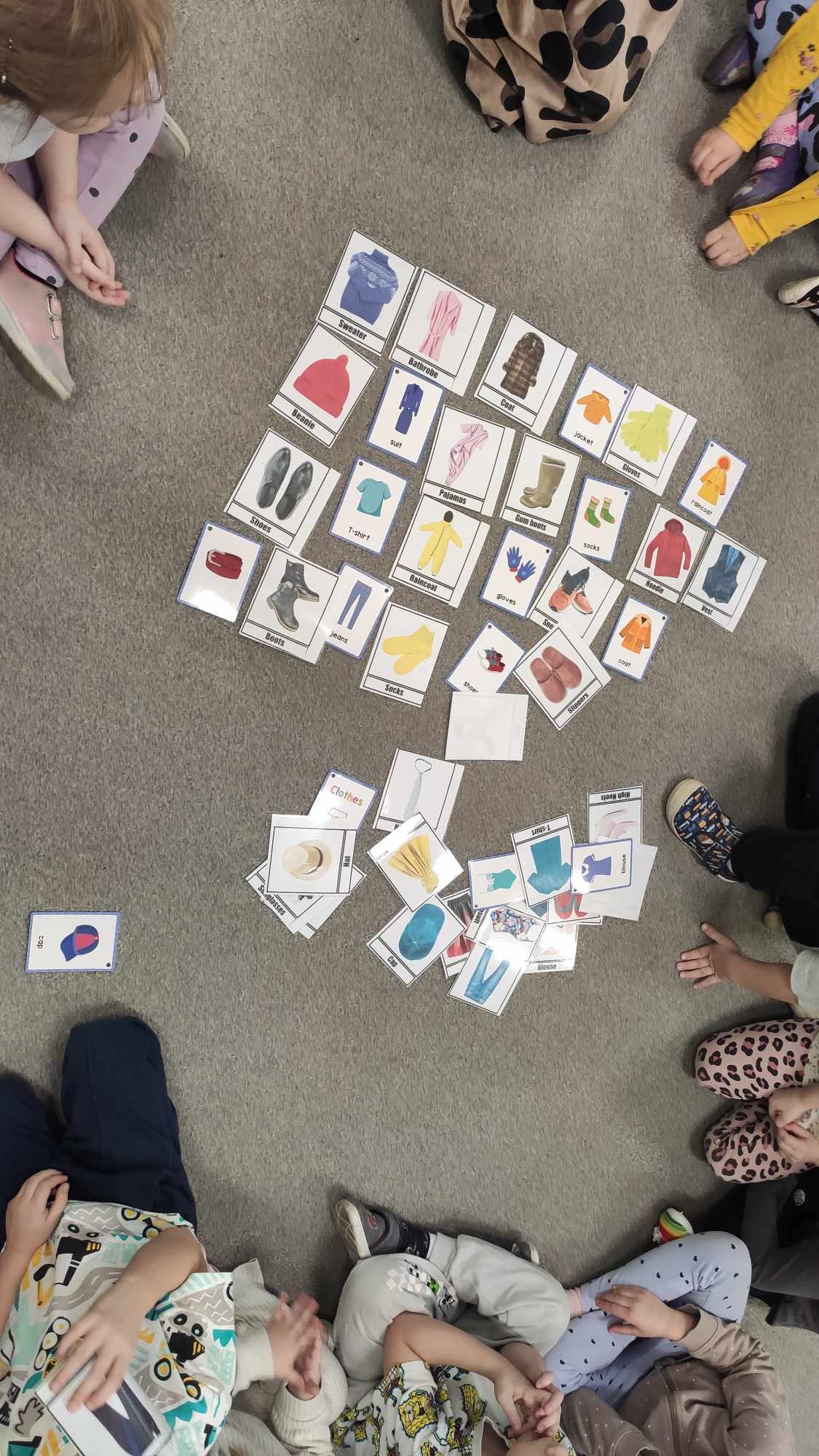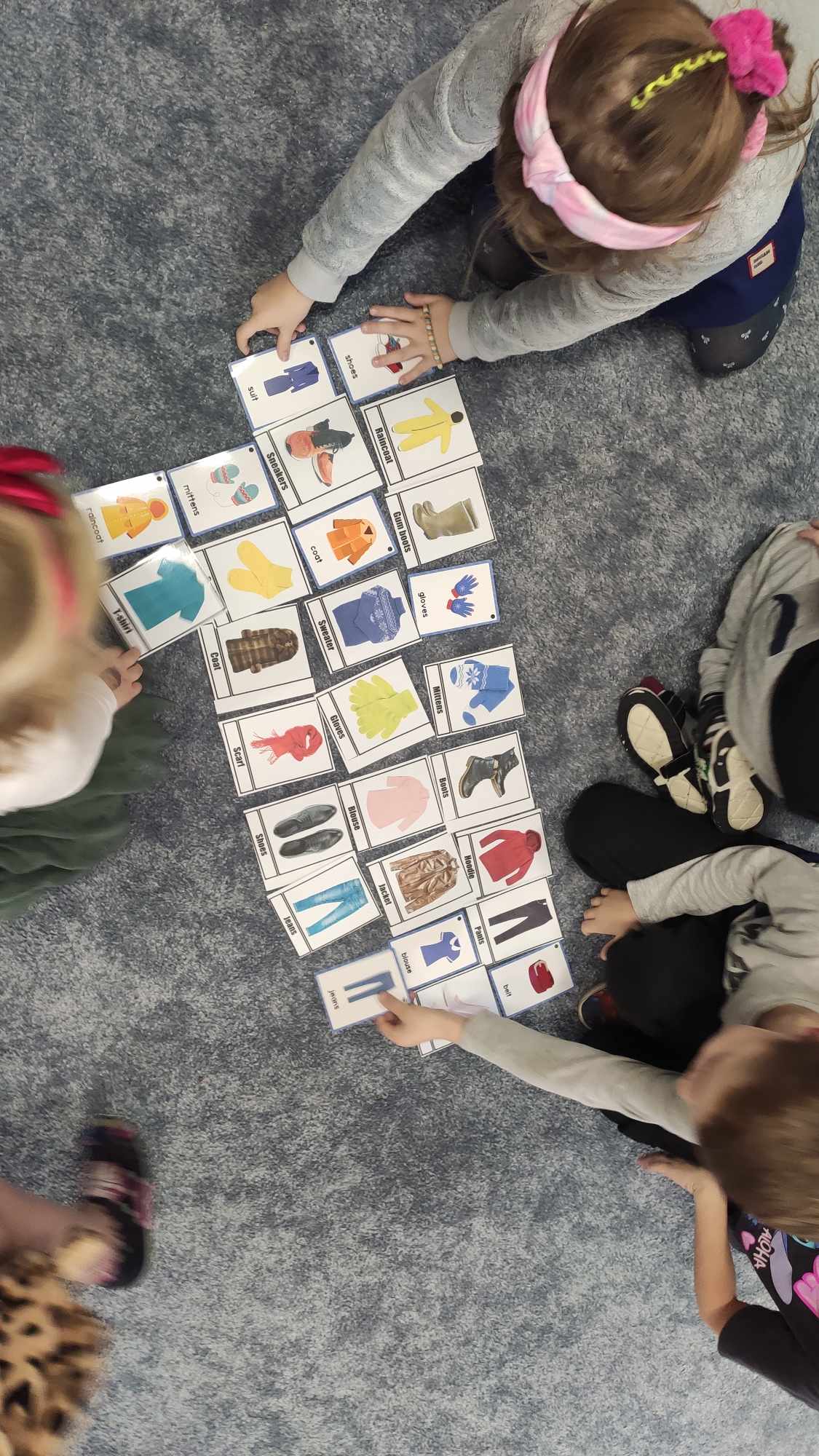 Dzieci z dużym zaangażowaniem dopasowywały flashcards z ubraniami do odpowiedniej pory roku – autumn i winter ️, rozpoznając, co zakładamy, gdy jest chłodno, wietrznie lub mroźno. Podczas zajęć przedszkolaki oglądały edukacyjny film „Steve and Maggie – Clothes”, poznając angielskie nazwy ubrań i ucząc się reagować na proste polecenia: