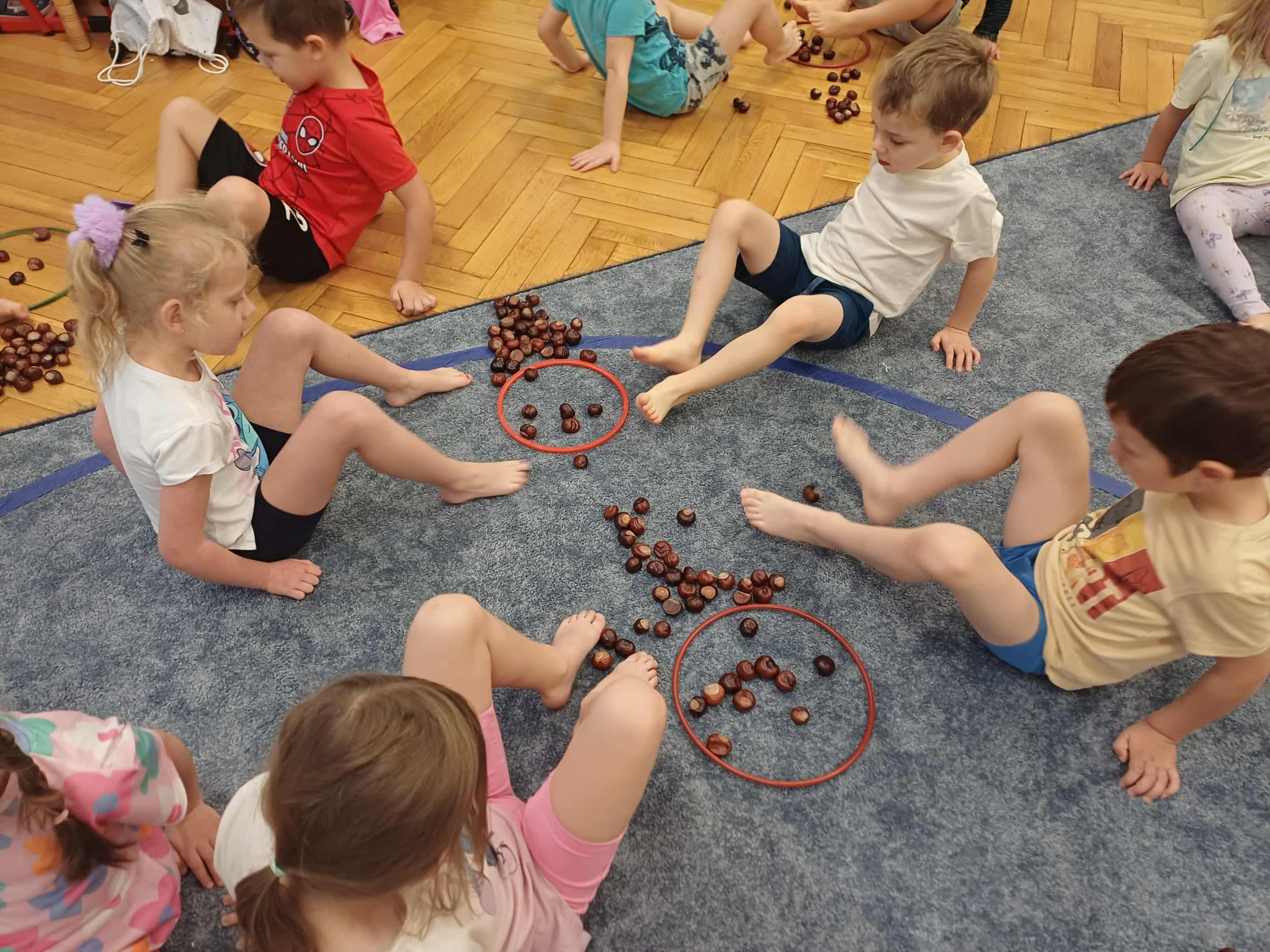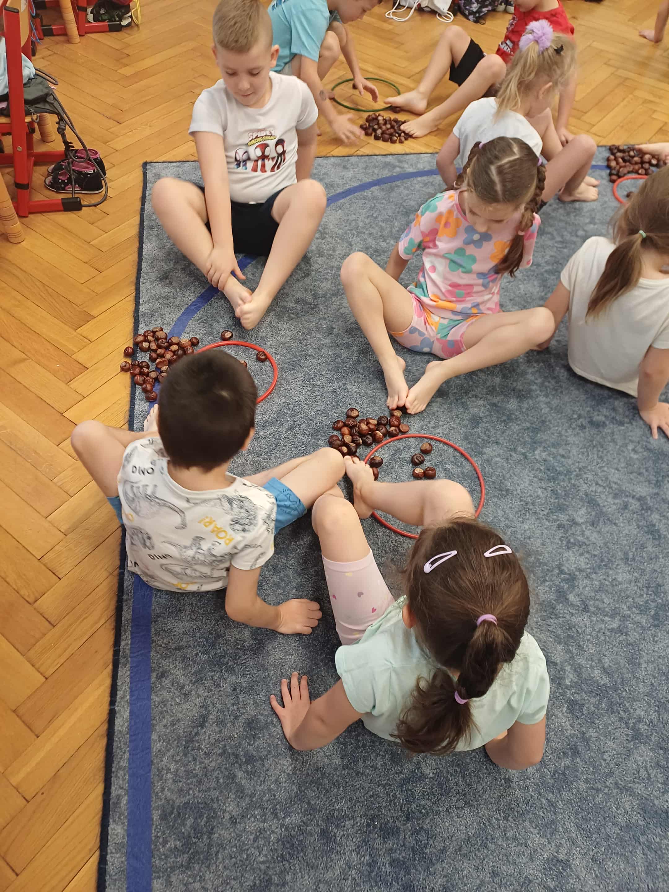 Tym razem dzieci rozwijały chwytność palców u stóp, koordynację wzrokowo-ruchową, koncentrację i umiejętność liczenie. Zabawa była przednia, a wartością dodaną był rozwój umiejętności naszych dzieci.