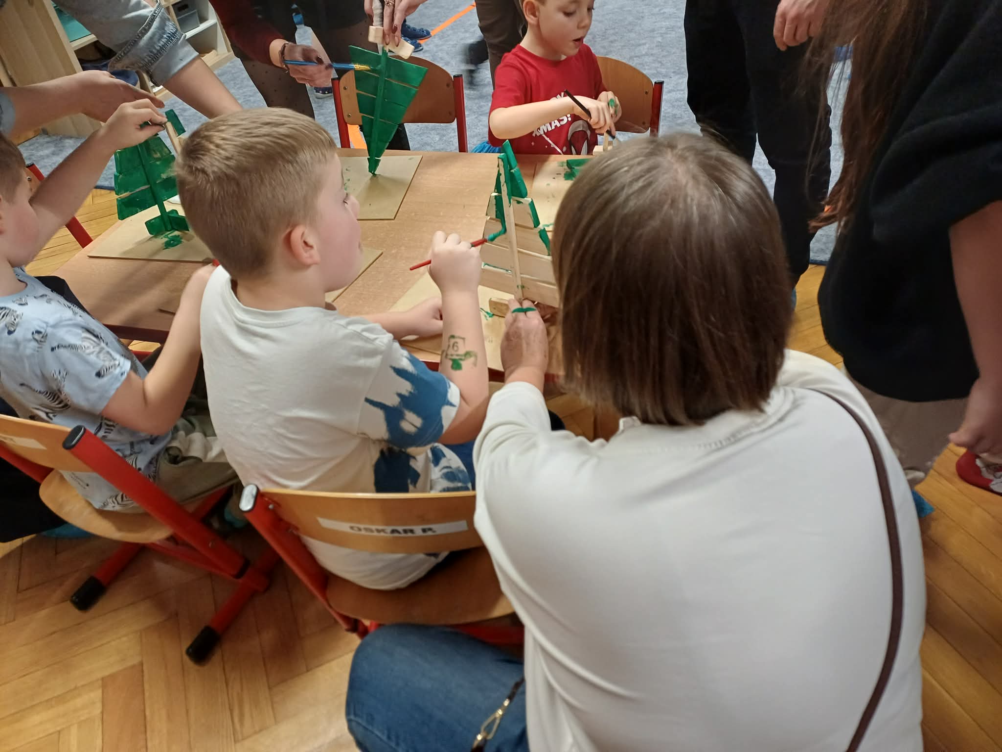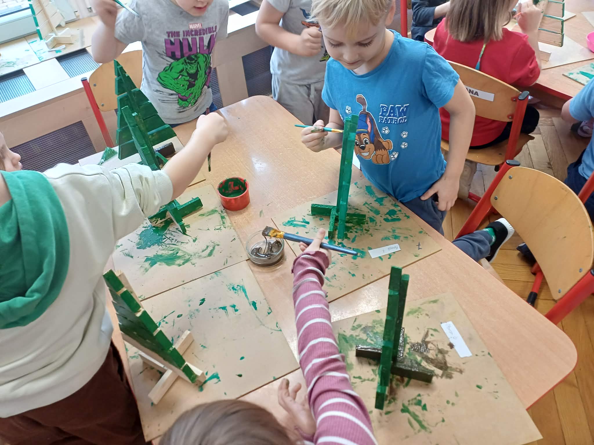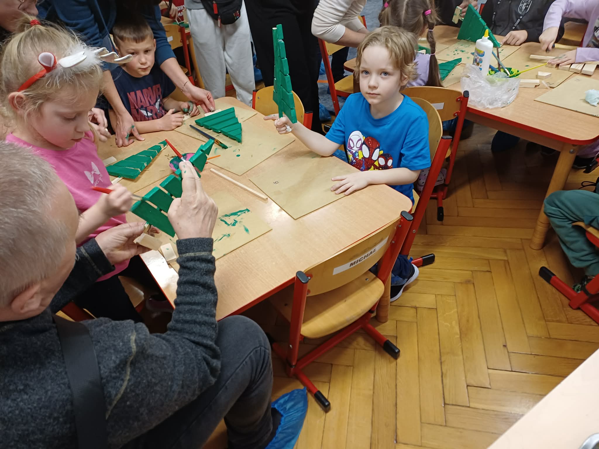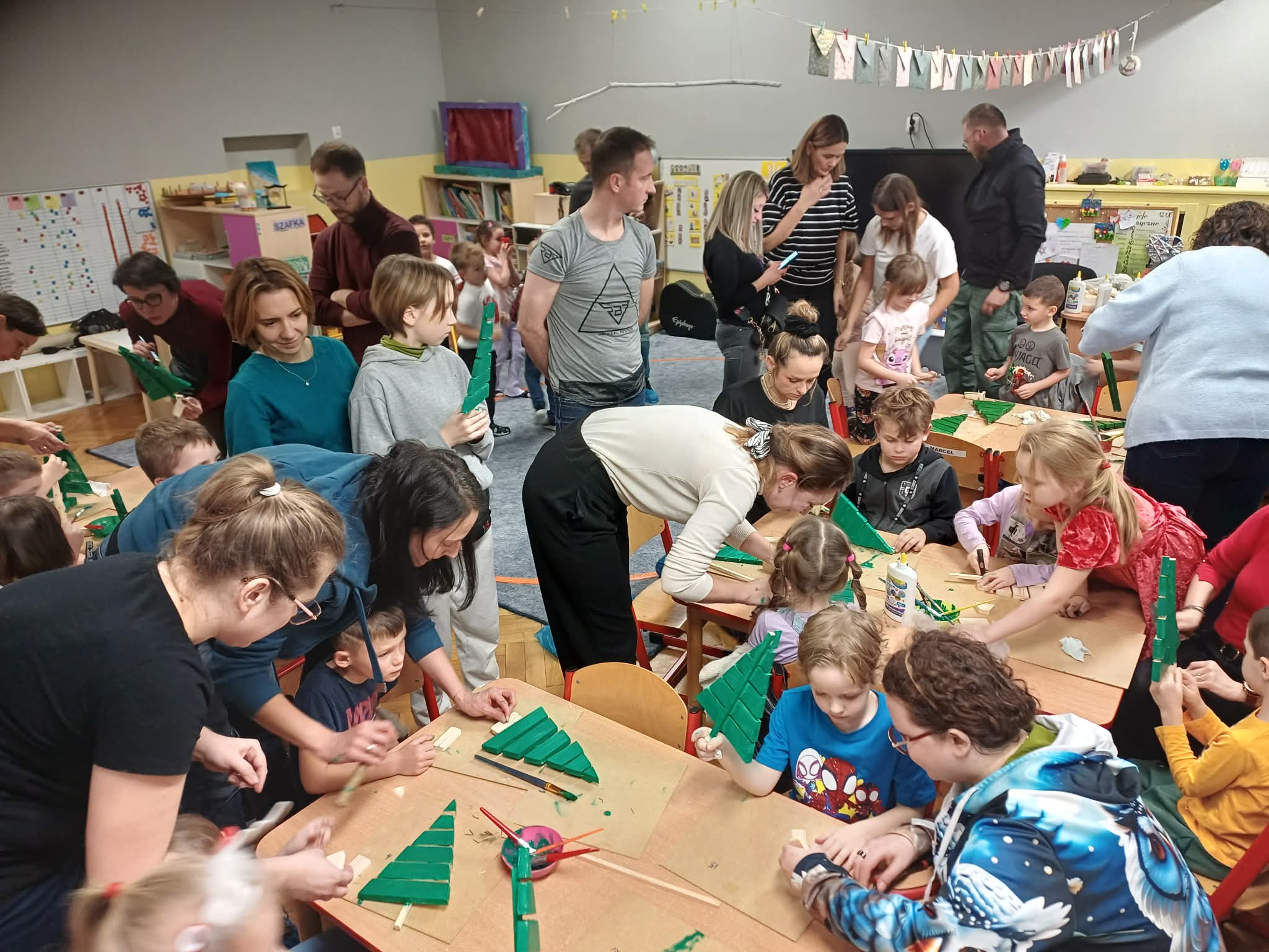 W naszej grupie z okazji "Mikołajek" zaprosiliśmy Rodziców do współpracy przy wykonywaniu drewnianych choinek, które później dzieci ozdabiały świecidełkami. Spotkanie było okazją do zobaczenia, jak radzi sobie każde dziecko w obliczu zadania oraz do spotkania z dzieckiem w sytuacji zadaniowej. Część dzieci radziła sobie tak dobrze, że nie potrzebowała pomocy rodziców. Dla każdego przybyłego rodzica zaskoczeniem było, jak dobrze dzieci posługują się narzędziami takimi, jak młotek i gwoździe. Wszystko to było prowadzone w sposób w pełni bezpieczny. Nad bezpieczeństwem czuwała p. Ania, która prowadzi grupę IV.