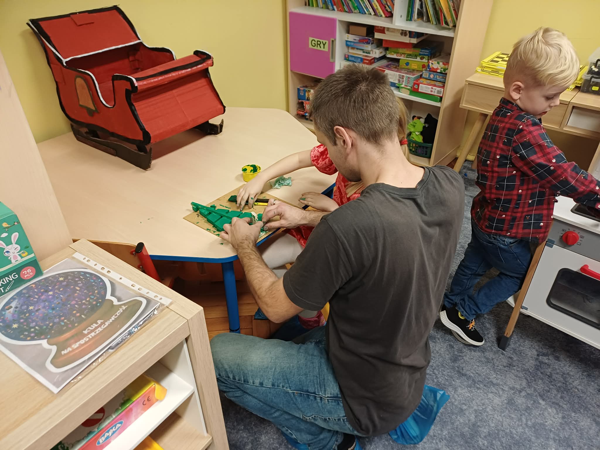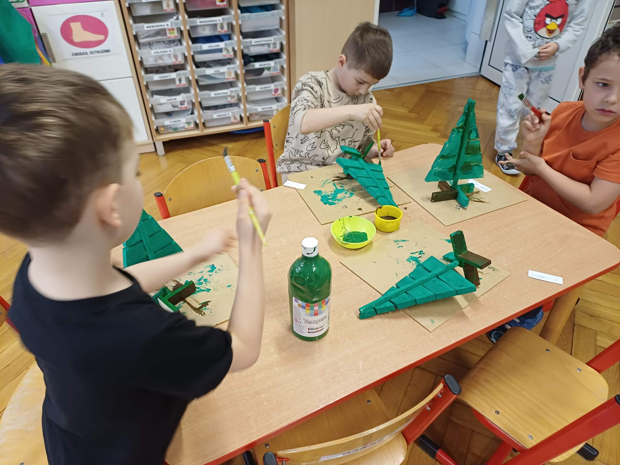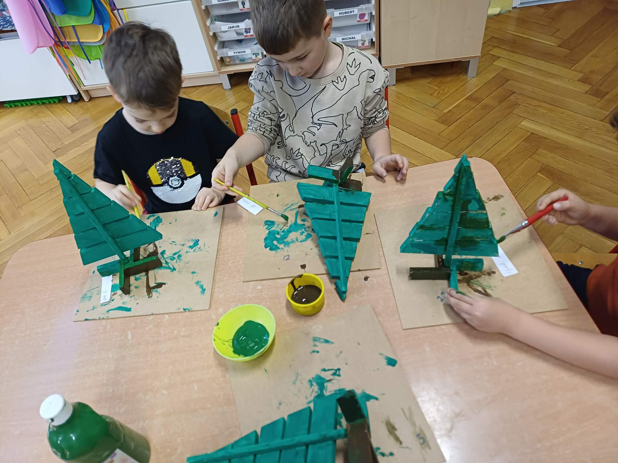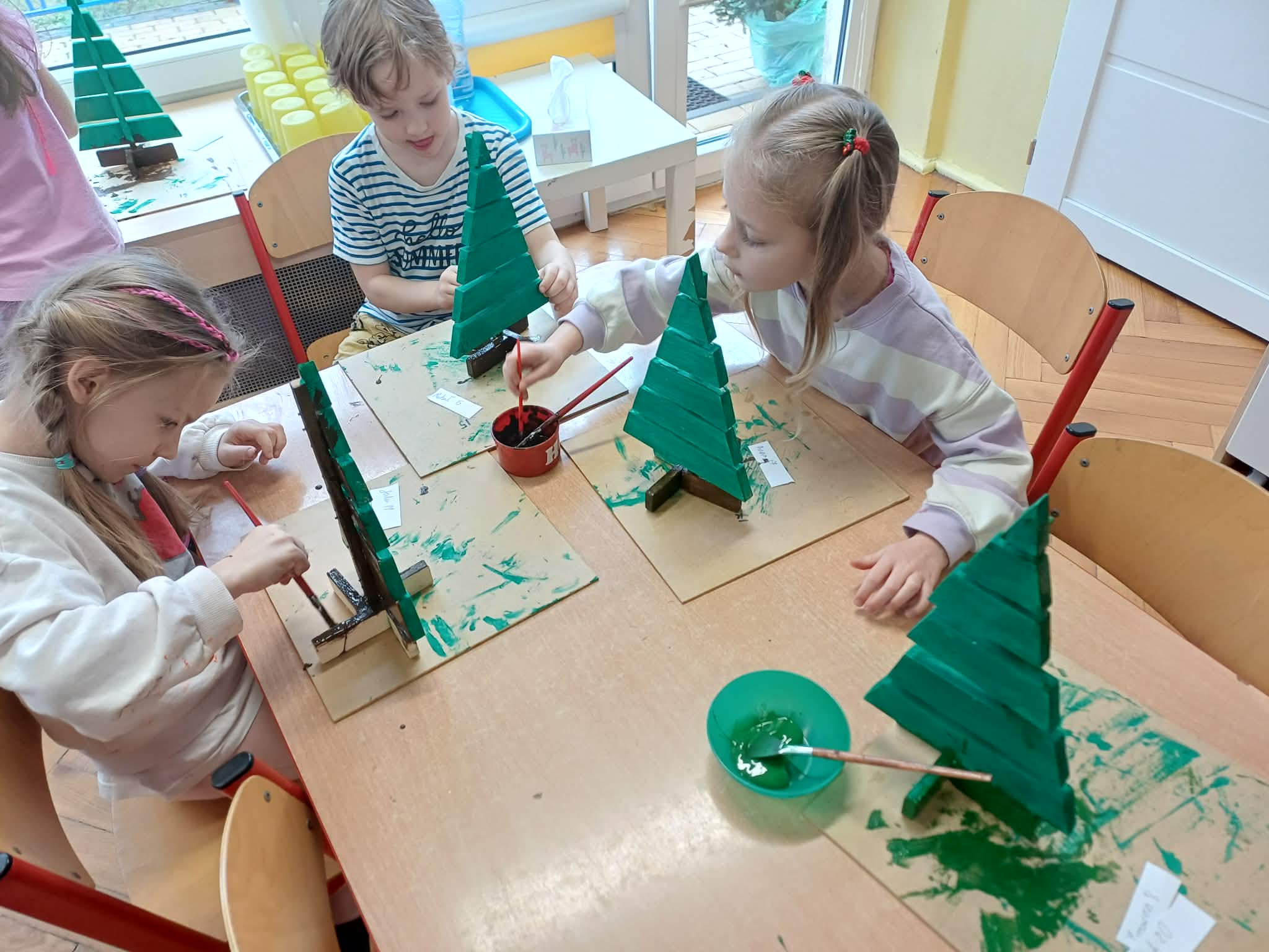 W naszej grupie z okazji "Mikołajek" zaprosiliśmy Rodziców do współpracy przy wykonywaniu drewnianych choinek, które później dzieci ozdabiały świecidełkami. Spotkanie było okazją do zobaczenia, jak radzi sobie każde dziecko w obliczu zadania oraz do spotkania z dzieckiem w sytuacji zadaniowej. Część dzieci radziła sobie tak dobrze, że nie potrzebowała pomocy rodziców. Dla każdego przybyłego rodzica zaskoczeniem było, jak dobrze dzieci posługują się narzędziami takimi, jak młotek i gwoździe. Wszystko to było prowadzone w sposób w pełni bezpieczny. Nad bezpieczeństwem czuwała p. Ania, która prowadzi grupę IV.