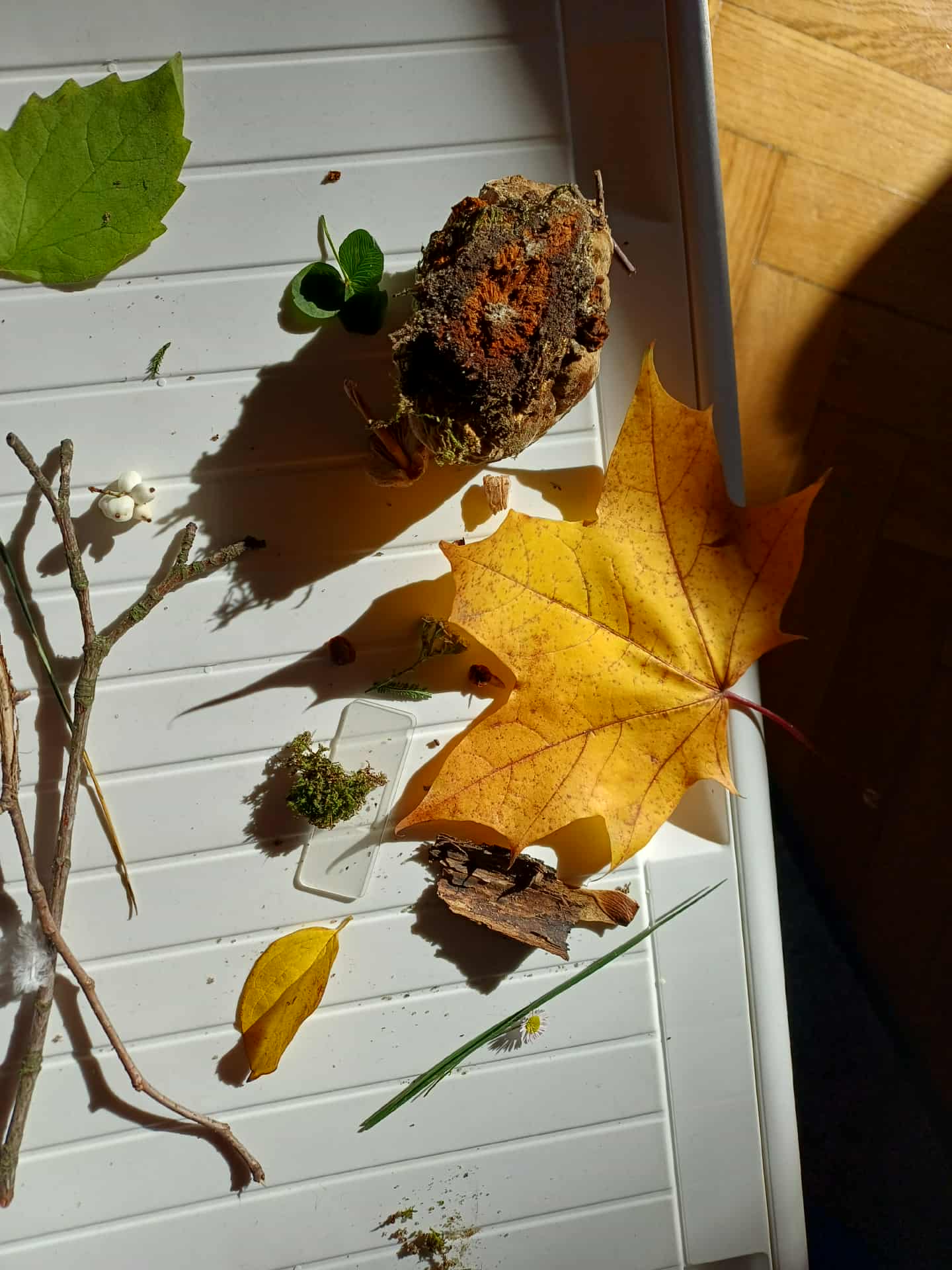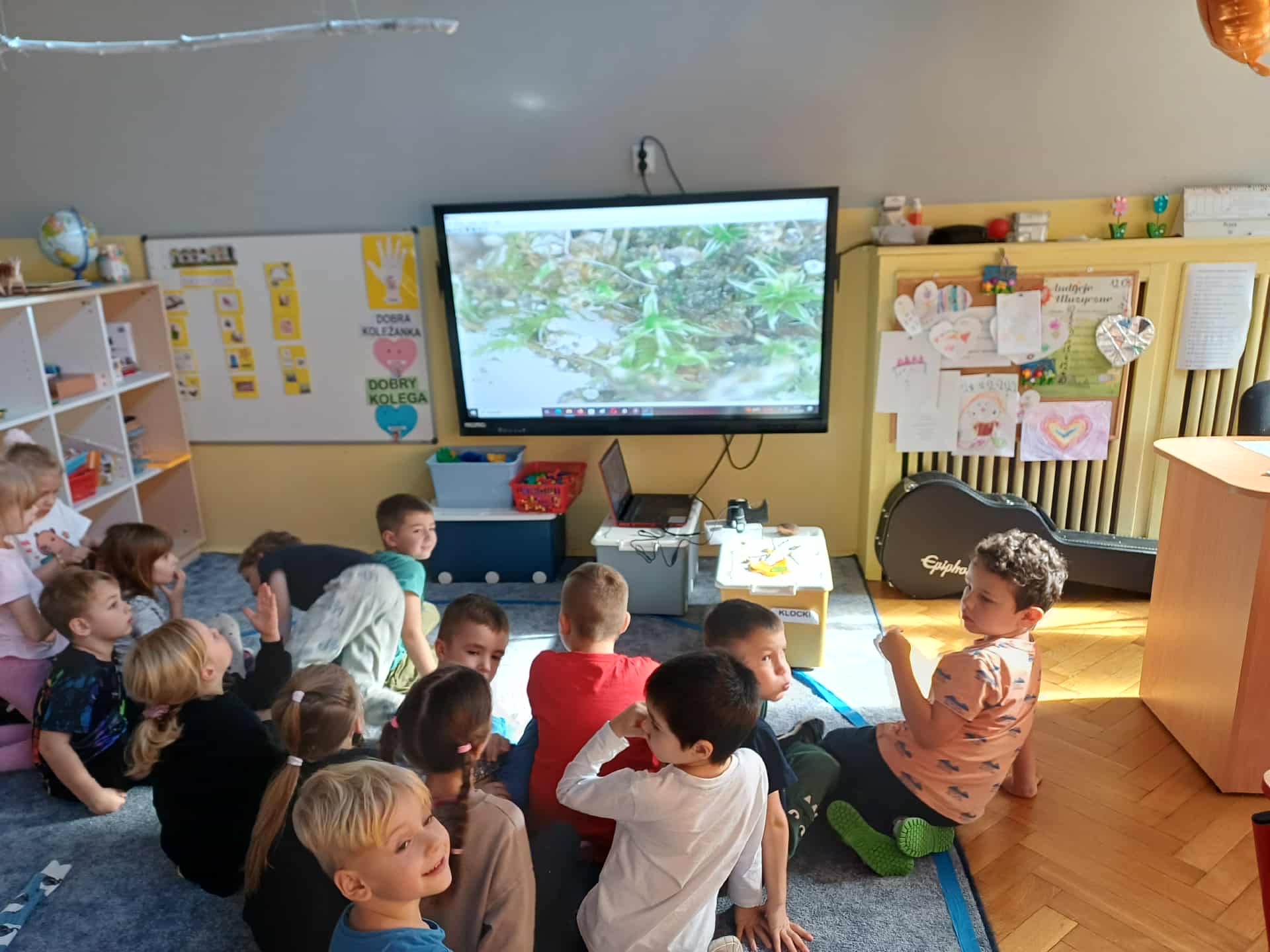 Zabawa zabawą, ale dzieciom bardzo podobała się możliwość obejrzenia liścia na naszej tablicy w olbrzymim powiększeniu optycznym. Obejrzeliśmy grzyby, mech, liście, ziarna, patyki, kamienie i biedronkę. Wartość z zajęć ogromna. Kto wie, może właśnie otworzyło się w dzieciach jakieś pragnienie zostania naukowcem?