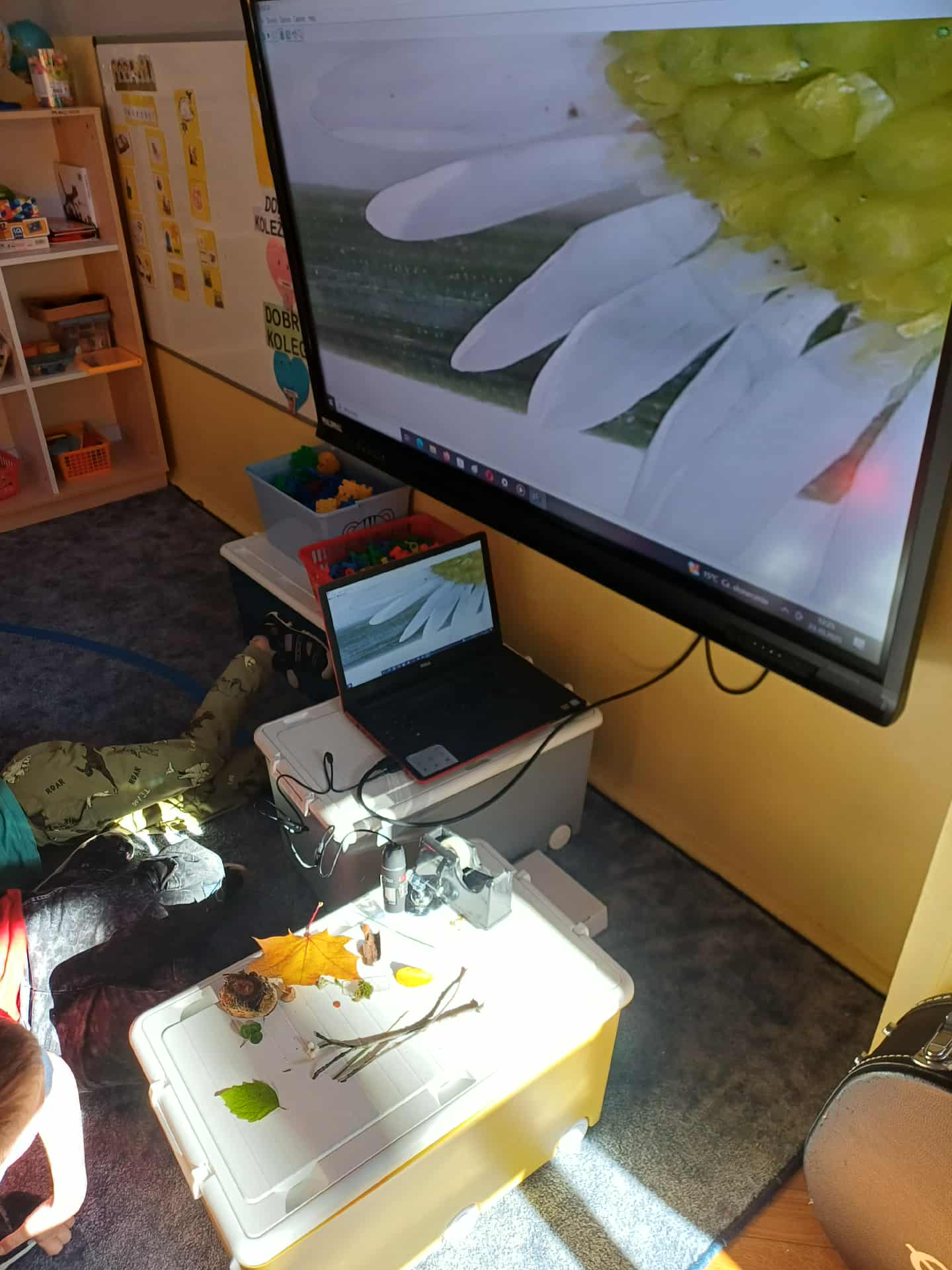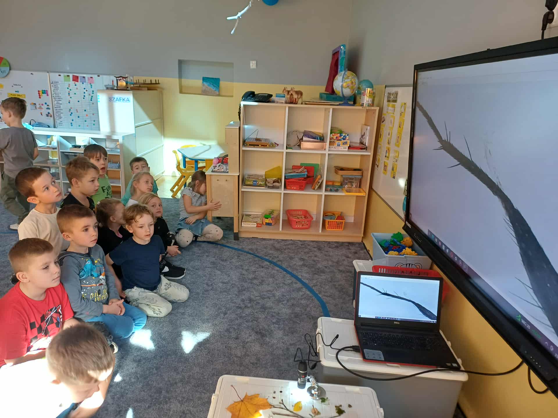 Dzieciaki z grupy IV są głodne wiedzy. W ostatnich rozmowach z nimi poruszyliśmy temat zmian w jesiennych liściach. Jedno z dzieci zapytało, jak wygląda liść jesienią. Powiedziałem, że możemy sprawdzić w ogrodzie podczas wyjścia. Zebraliśmy liście, a przy tym inne ciekawe jesienne obiekty (w zabawie badawczej nie ucierpiało żadne zwierzę). Następnie przy pomocy klasowego mikroskopu oglądaliśmy odnóże muchy (była już martwa, więc w ramach badań prawie naukowych wykorzystaliśmy ją). Powiększenie 20 x było fascynujące dla dzieci. Następnym przystankiem było powiększenie mikroskopu otrzymanego z zaprzyjaźnionego przedszkola, a tu powiększenie było znacznie większe. Zaczęliśmy od powiększenia 50 x, a skończyliśmy na... kto to wie?