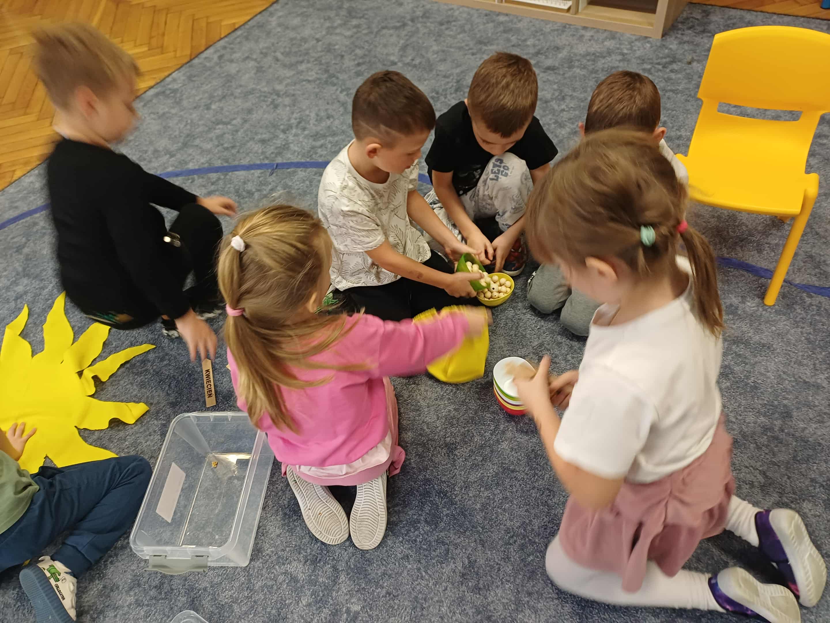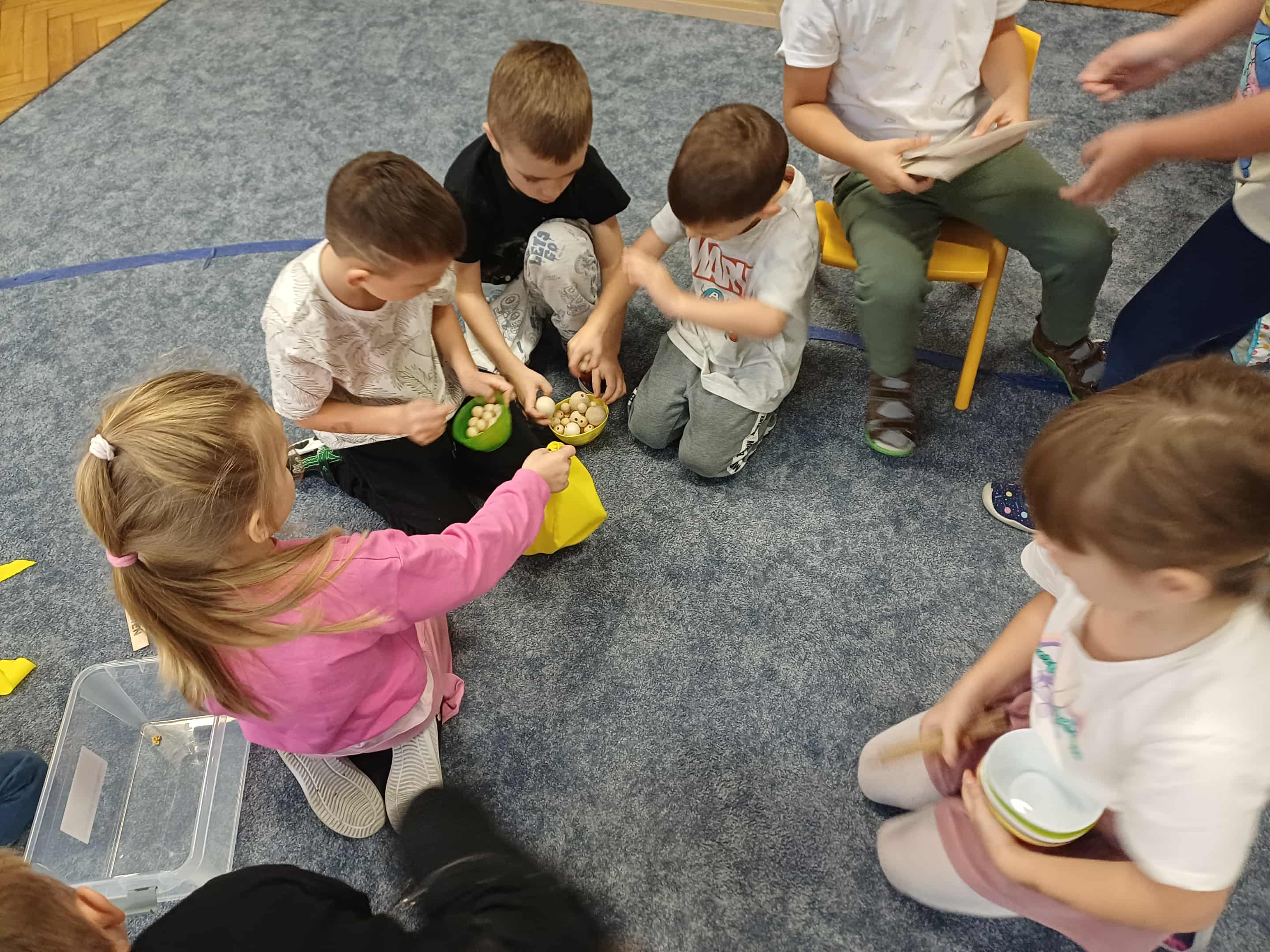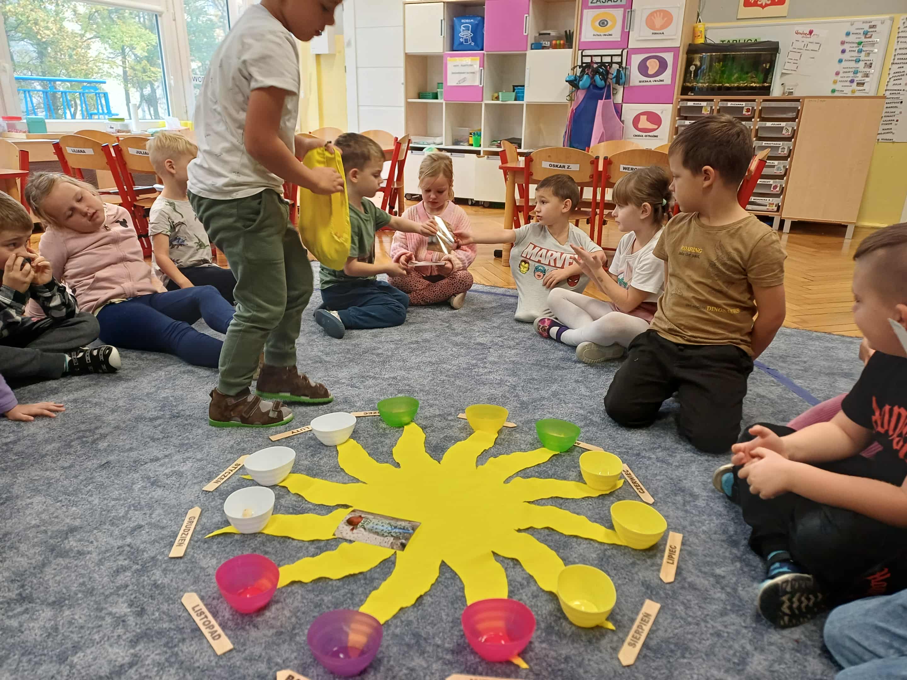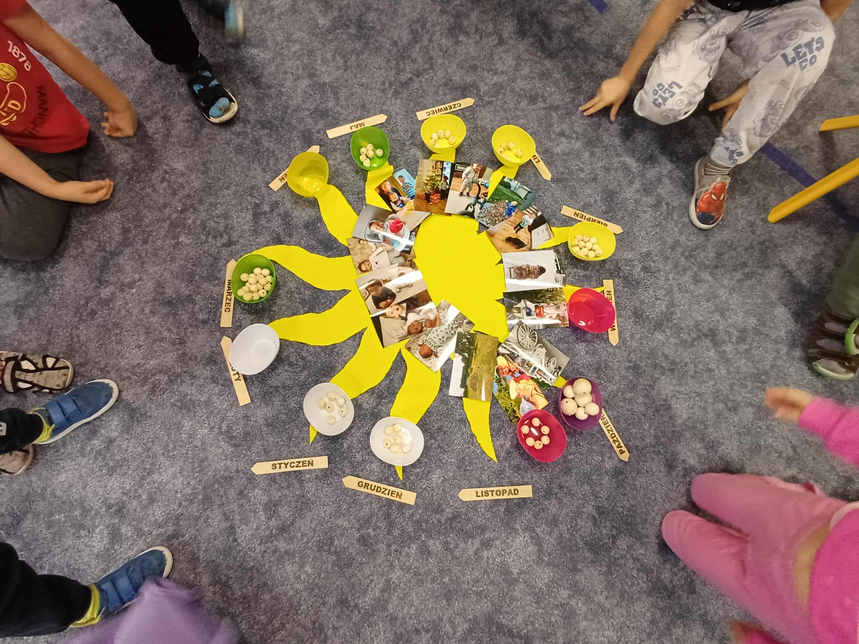 A tak na poważnie, to urodziny każdego dziecka z naszej grupy można obchodzić na dwa sposoby: tradycyjnie lub "po naszemu". Większość rodziców wybiera tę drugą opcję, ponieważ dostarcza ona wielu wspaniałych chwil i emocji. Rytuał jest już tak silnie zakorzeniony w naszej grupie, że obecnie nauczyciel daje dzieciom zestaw słoneczka urodzinowego i jedynie dogląda procesu przygotowania do urodzin (tu dzieci wykazują się umiejętnościami doboru miseczek do pory roku, układają także znaczniki z nazwami miesiąca grotami zgodnie z ruchem wskazówek zegara - poprawnie pod kątem występowania w roku [czytają nazwy miesiąca].