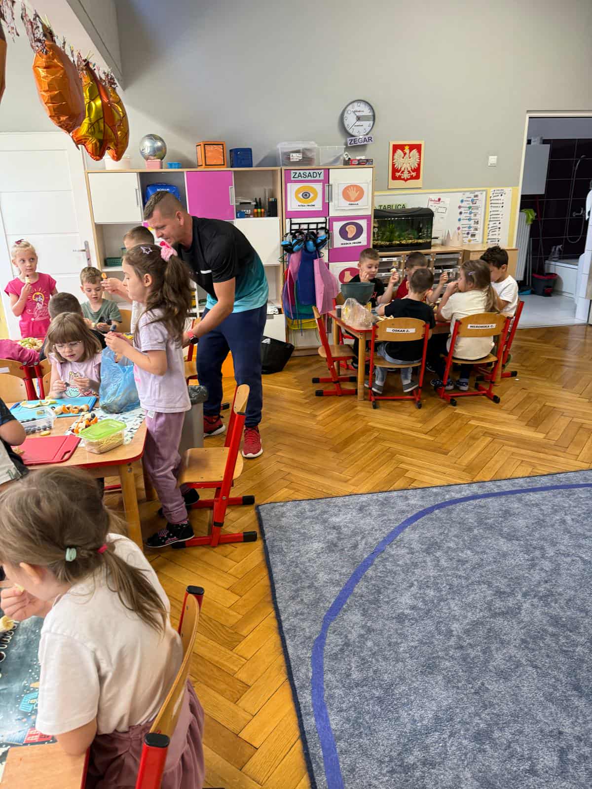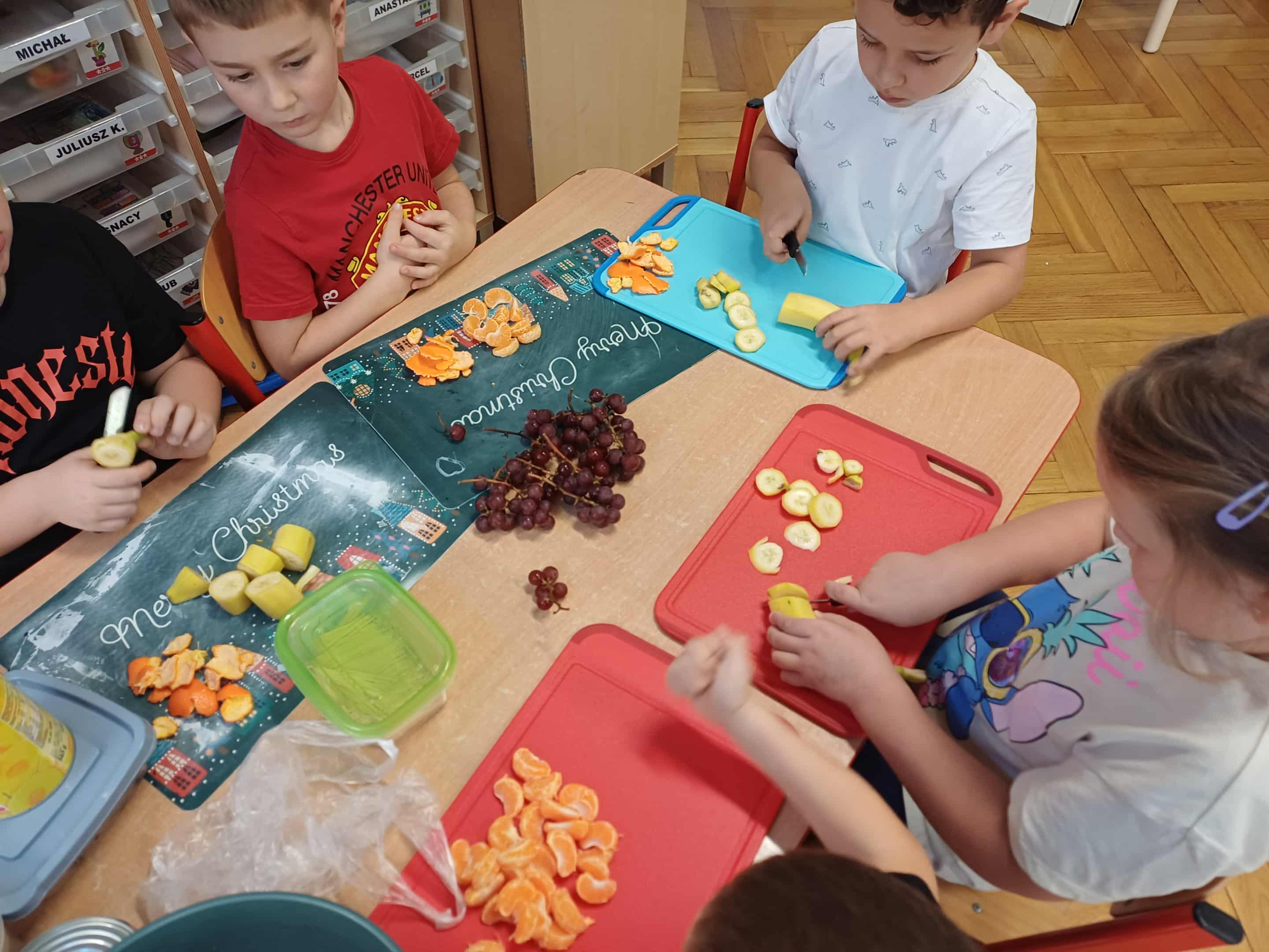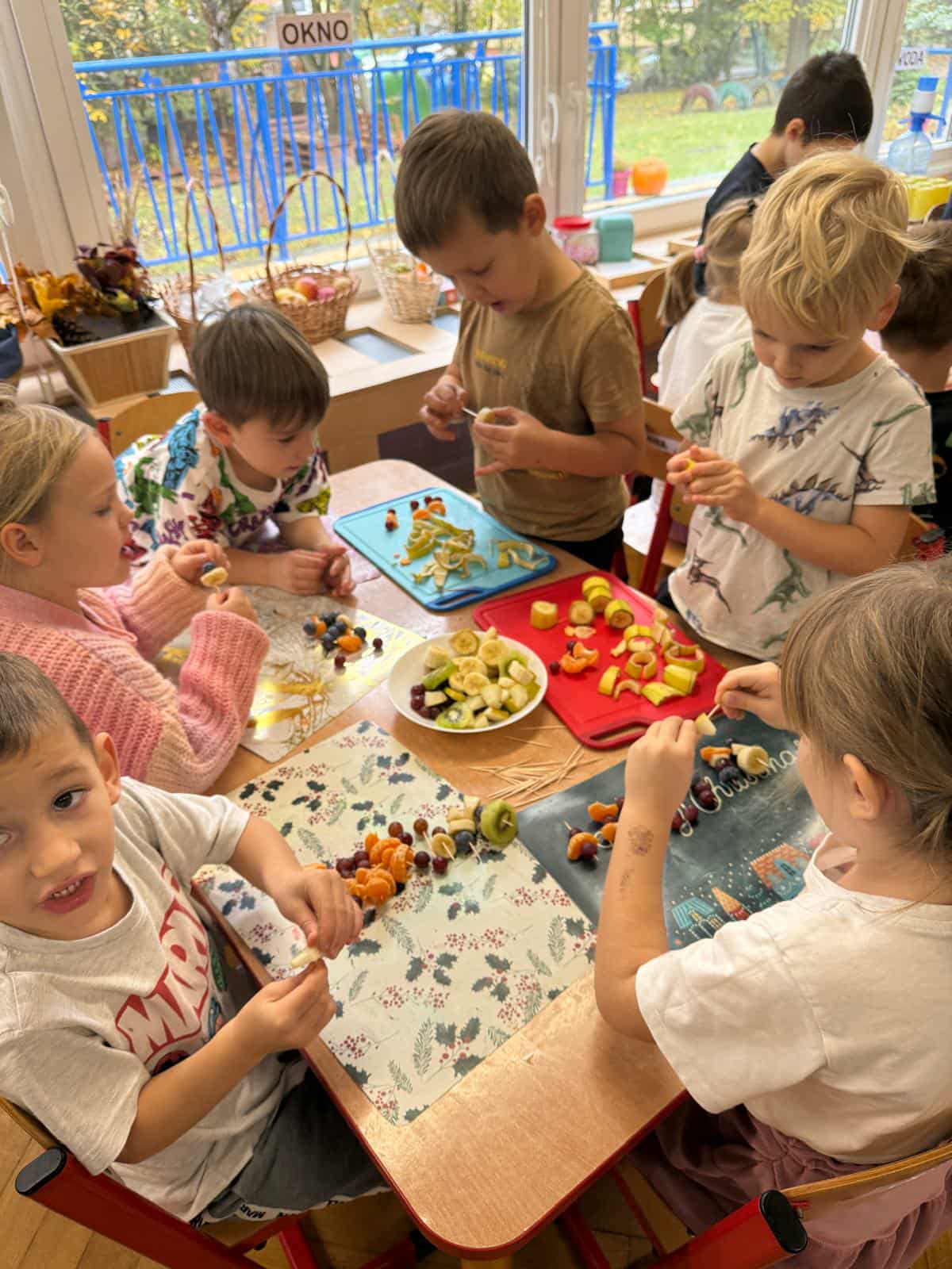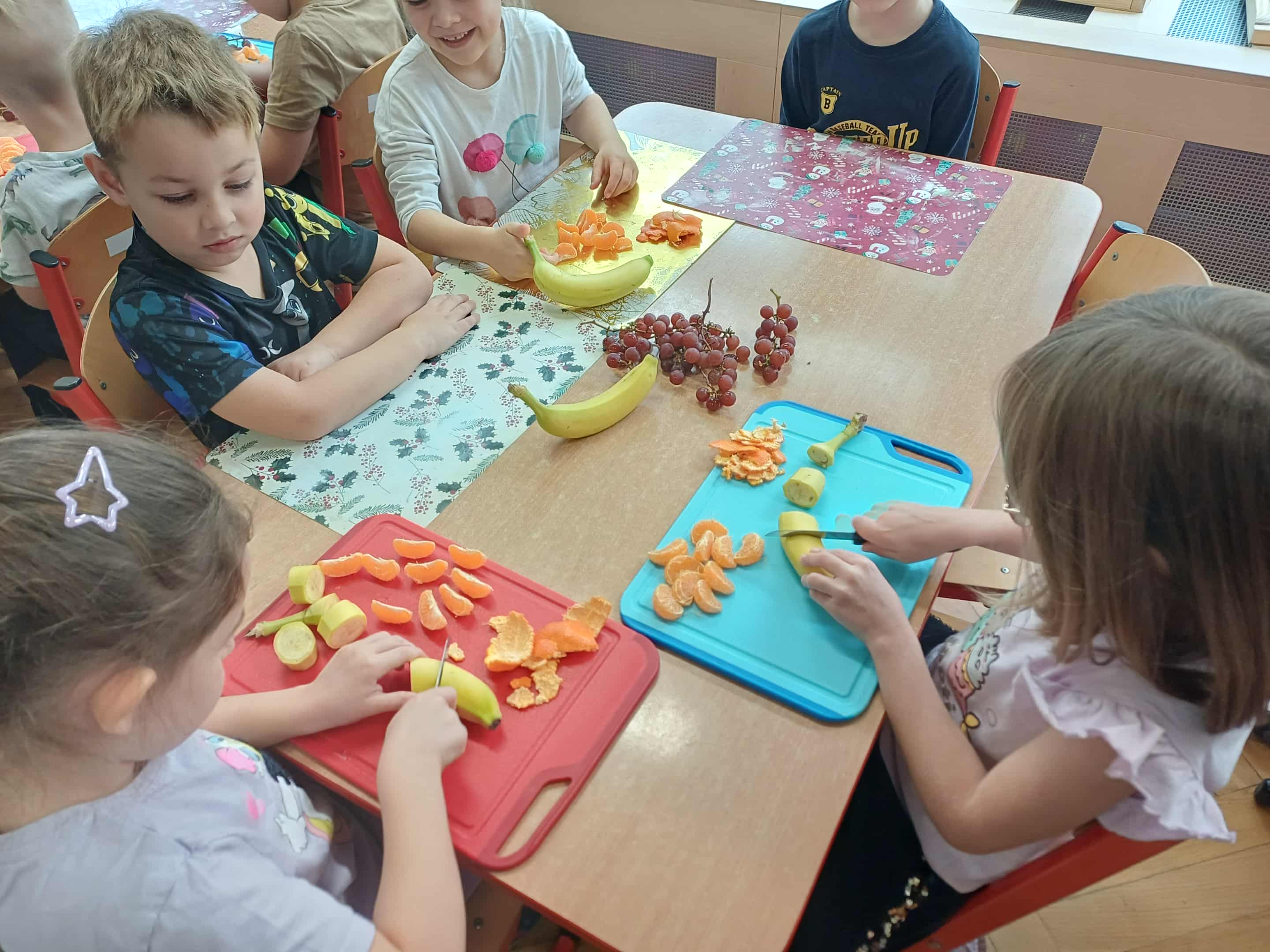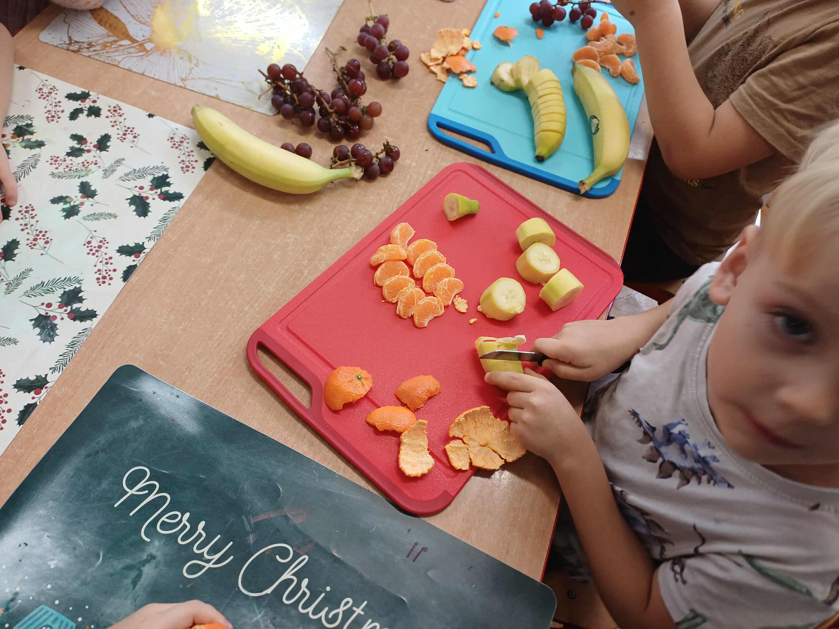 Grupową umową jest także wychodzenie ze słodyczy na urodzinach na rzecz zdrowia i smaku. Tym razem rodzice przygotowali wszystko do robienia owocowych szaszłyków lub sałatki owocowej. Dzieci korzystały z nożyków i deseczek krojąc banany po czym wszystkie składniki włożono do misek. Dzieci samodzielnie komponowały szaszłyki lub częstowały się owocami robiąc sałatkę owocową w brzuchach.
