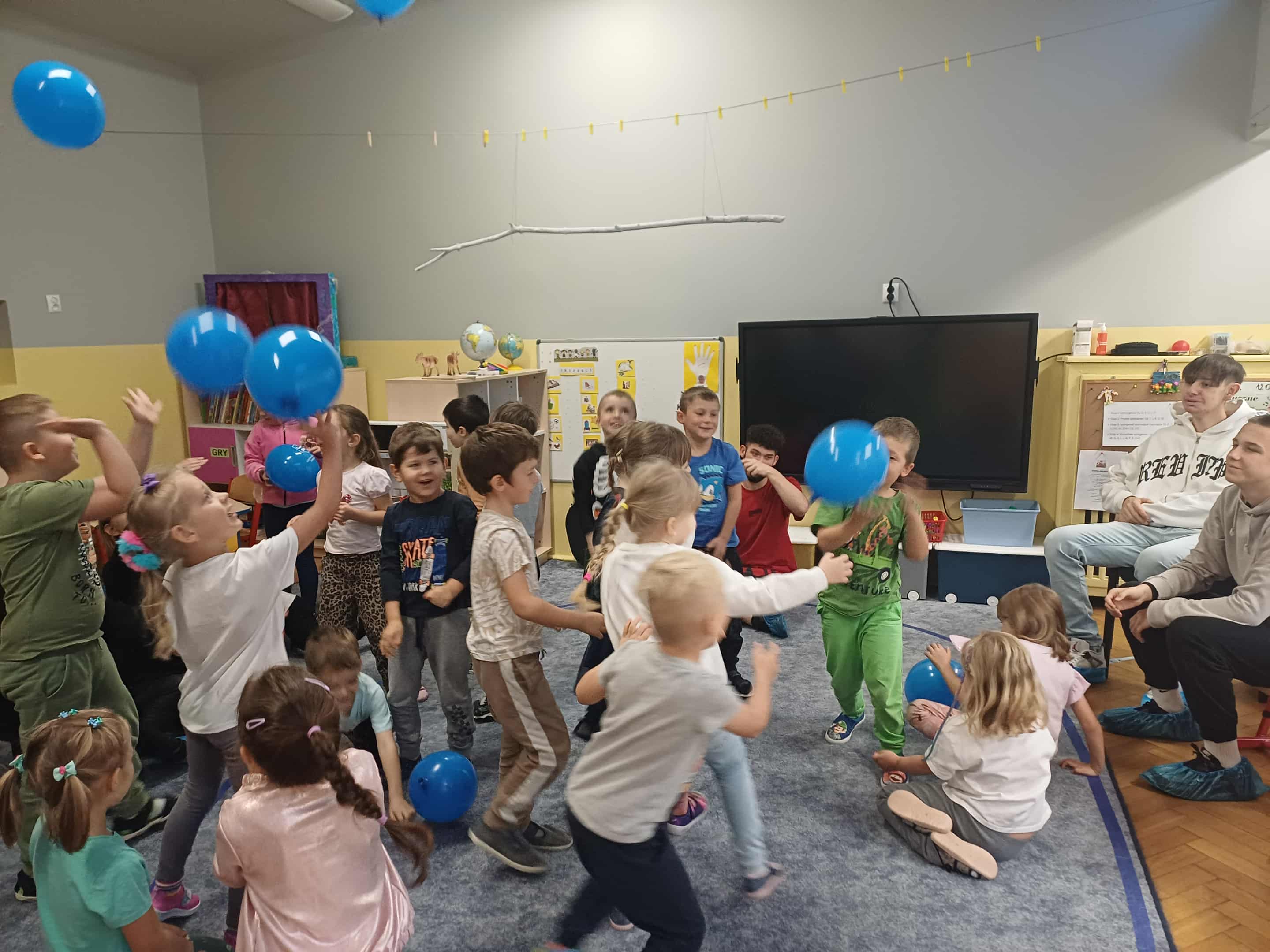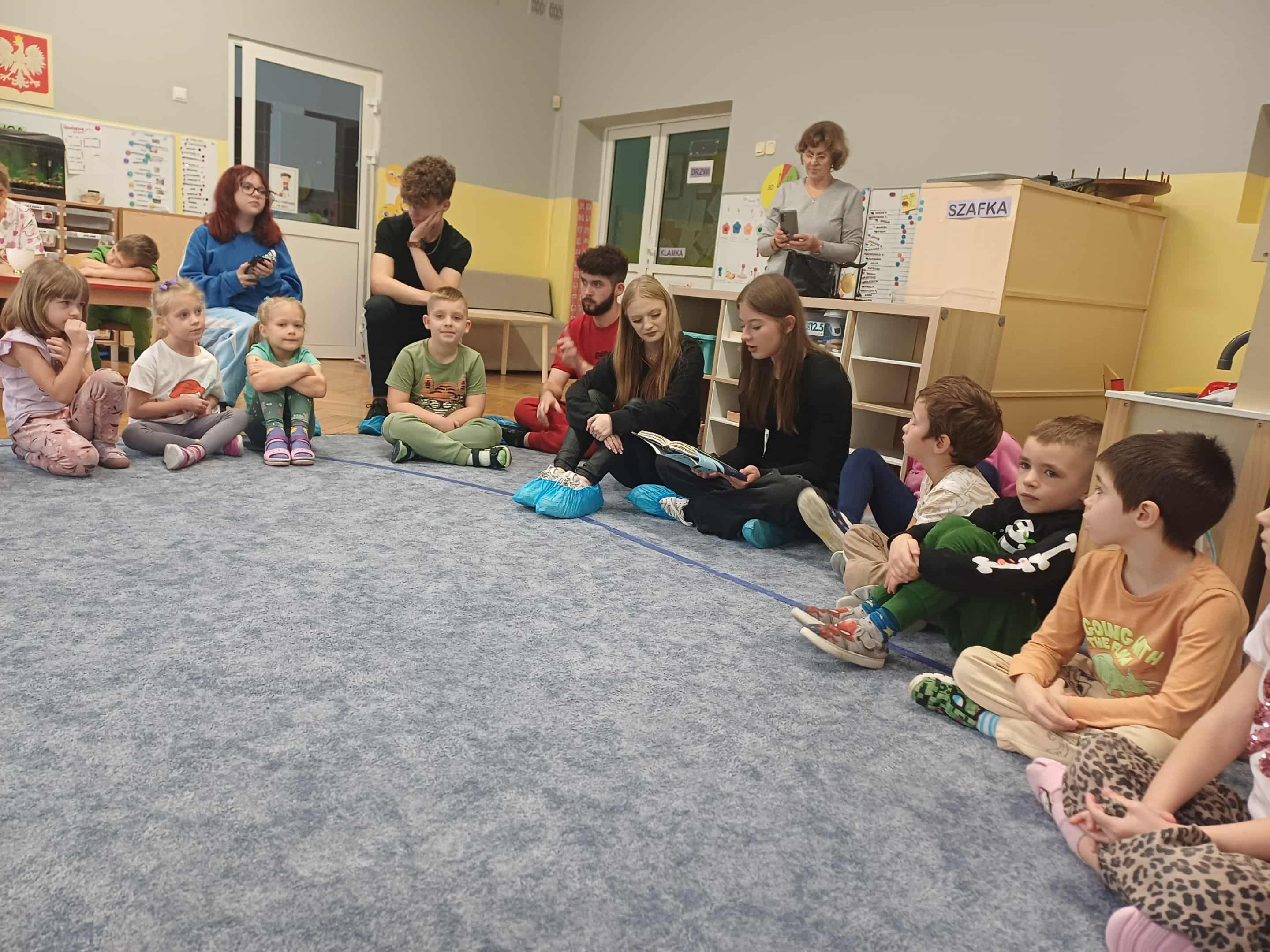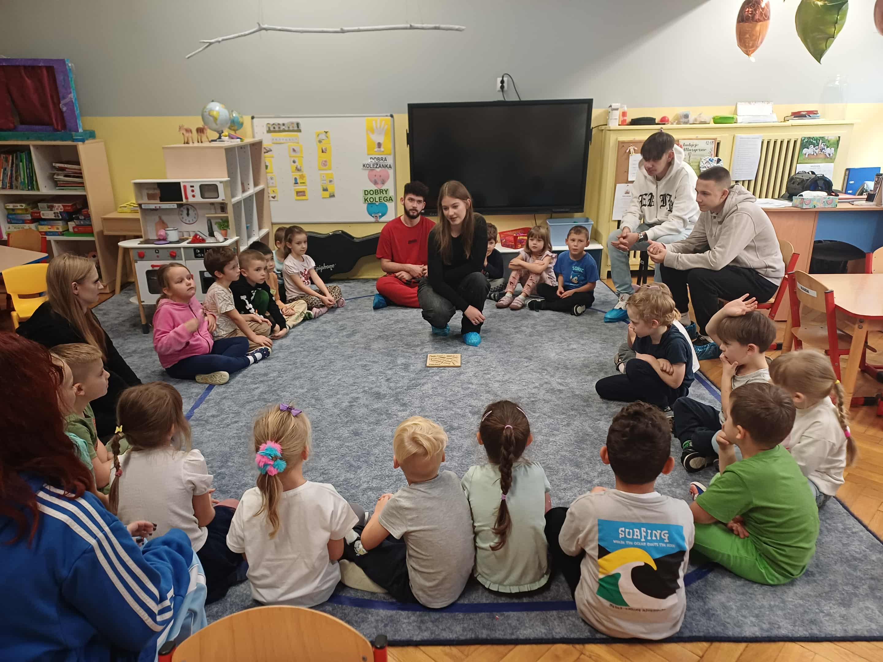 W czwartek 9.10.2025 roku grupę IV odwiedziła młodzież z Ochotniczych Hufców Pracy. Spotkanie z dziećmi dostarczyło młodzieży wielu wspaniałych wrażeń. Spotkanie rozpoczęliśmy od zabaw w kole. Po chwili zabawy wszyscy usiedliśmy w kole. Młodzież opowiadała o zawodach, w których pobiera nauki. Dzieci, z dziecięcą ciekawością i brakiem ograniczeń, zadawały pytania o specyfikę zawodu. "Jagódki" dowiedziały się, czym zajmuje się sprzedawca, fryzjer, cukiernik, kucharz, mechanik samochodowy... oraz drukarz.