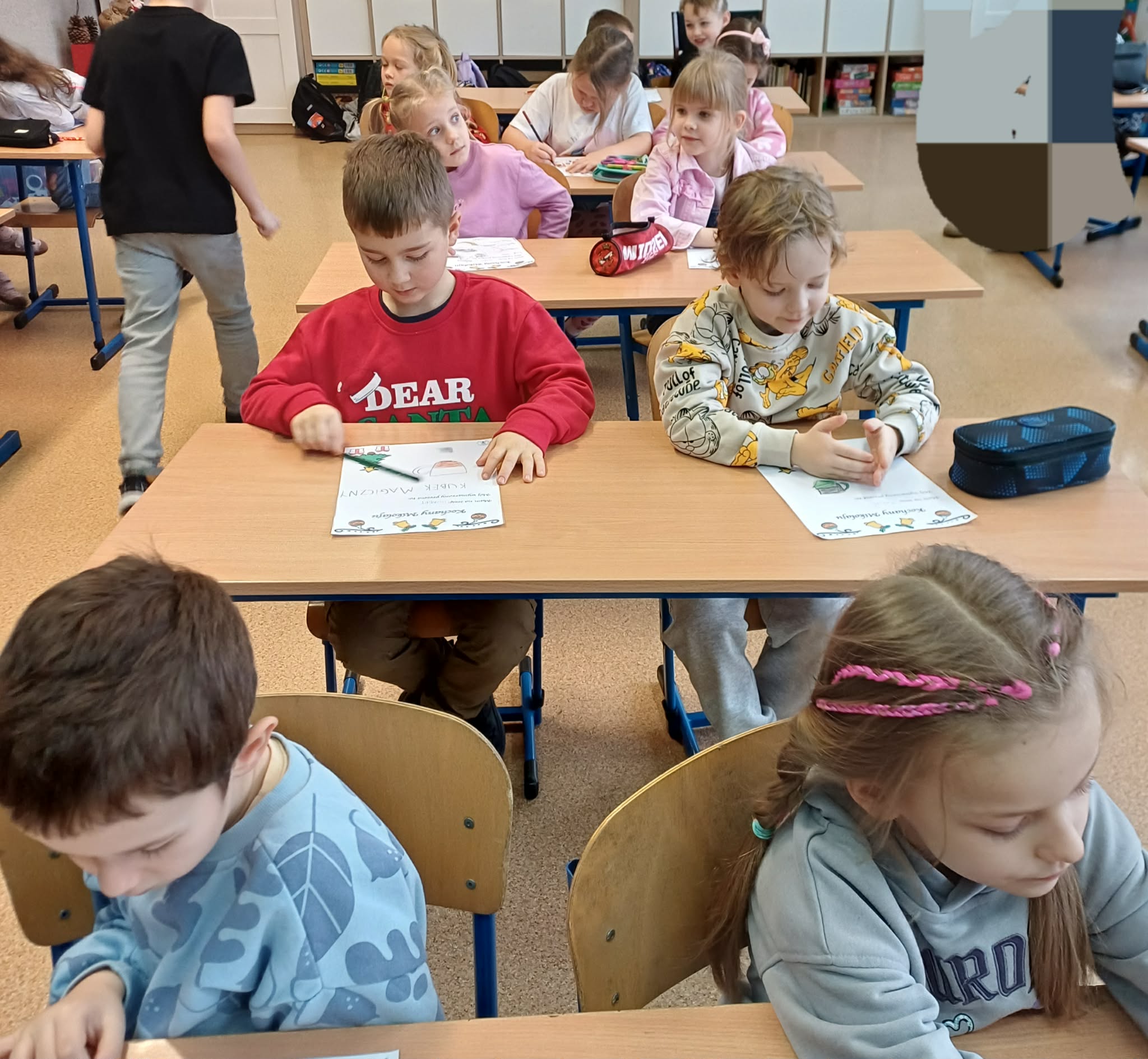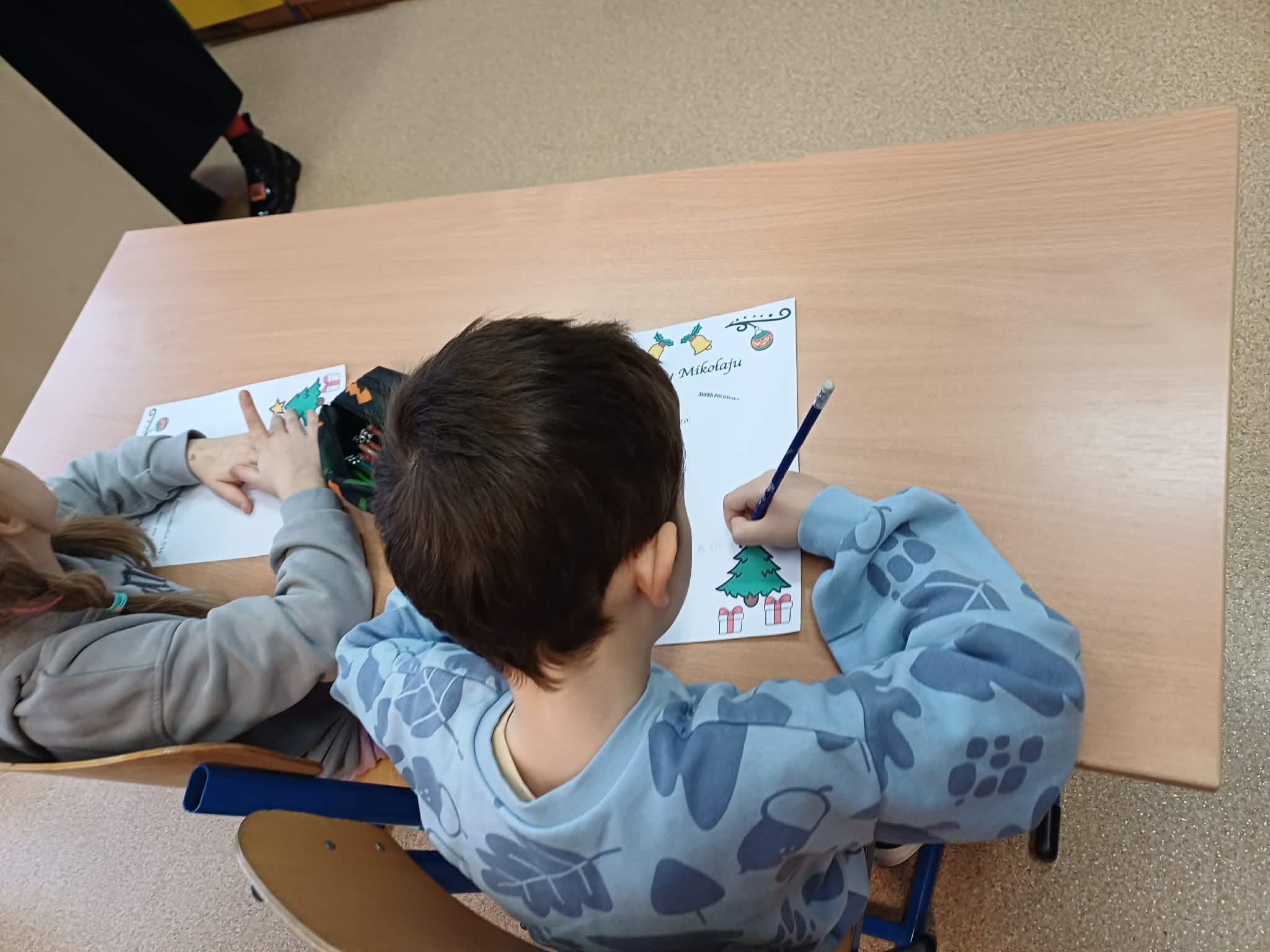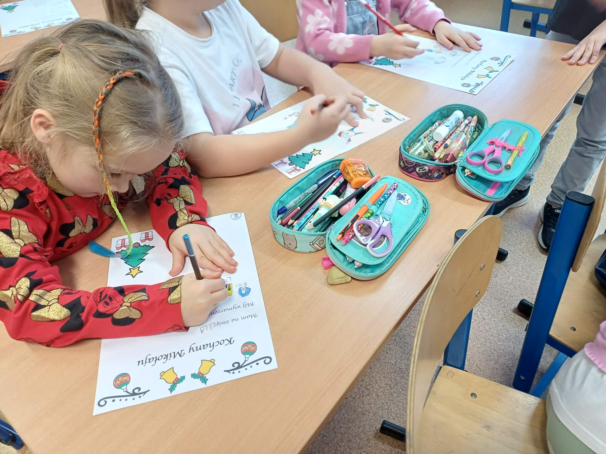 Czas spędzany w przedszkolu jest błogi i wypełniony po brzegi zabawą i edukacją. Niestety wszystko, co dobre szybko się kończy. Część ze starszaków po wakacjach pójdzie do szkoły. Ażeby nie był to krok w nieznane wybraliśmy się na zajęcia specjalnie przygotowane przez nauczyciela podstawówki. Dzieci dostały kartki z przygotowanym listem do świętego Mikołaja, który miały uzupełnić wpisując listę prezentów lub rysując je. Ku zaskoczeniu nauczycielki szkolnej większość dzieci wpisała w list swoje wymarzone zabawki, a reszta narysowała je. Każde dziecko skończyło swój list i przystąpiło do kolejnych zabaw.